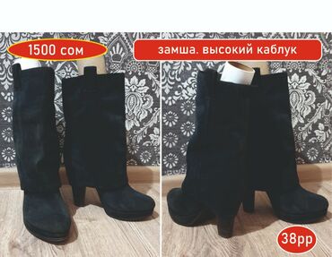 2) Черные замшевые сапоги дэми на высоком каблуке. Платформа спереди, удлинённый голенище. Размер: 38. Цена: 1500 сом. идеальное состояние.