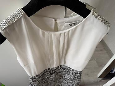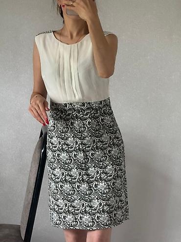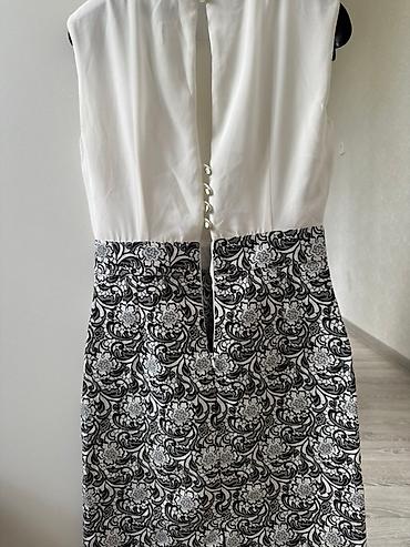 Размер на ярлыке не указан на фото; ориентируйтесь по силуэту и длине до колена. Цвета: белый/черный с серыми оттенками в узоре. Стильное, женственное, с элегантным блеском декора на плечах.