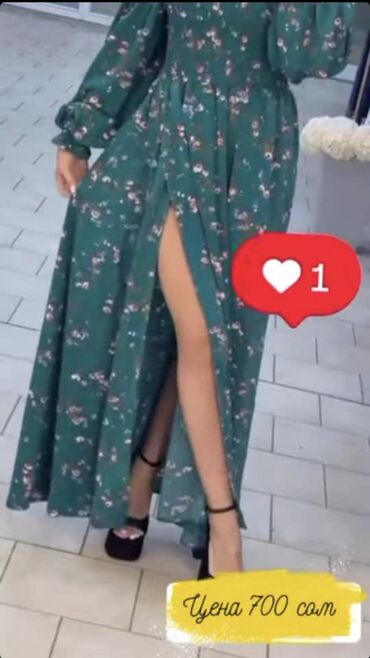 Платья женские — два стильных варианта. 1) Зеленое макси с цветочным принтом: - Легкая струящаяся ткань - Длинные рукава с объемом и манжетами - Высокая разрезная юбка спереди - Завышенная линия т...