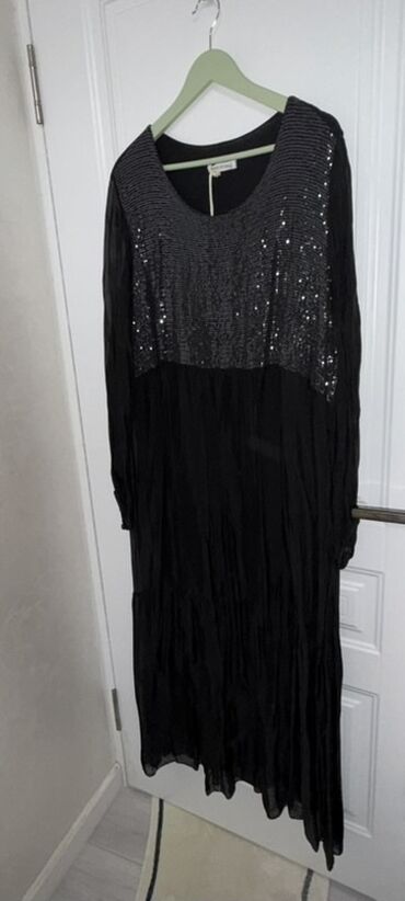 Элегантное женское платье миди черного цвета с длинными рукавами. Верхняя часть платья украшена эффектной вставкой с пайетками, создающей мерцающий акцент. Модель имеет свободный крой и ярусную юбку, обеспечивая комфорт и непринужденный силуэт. Идеально подходит для особых случаев или вечерних выходов.Низ платья выполнен из легкой, струящейся ткани. Универсальный дизайн позволяет сочетать его как с повседневной, так и с более формальной обувью.