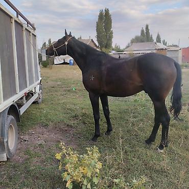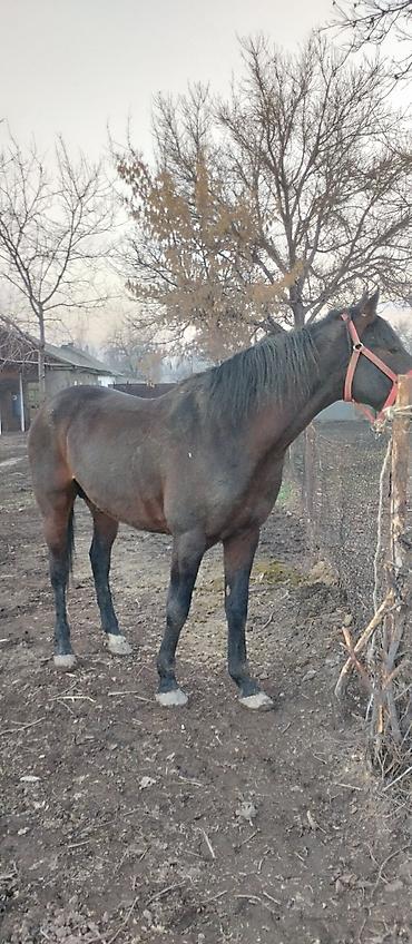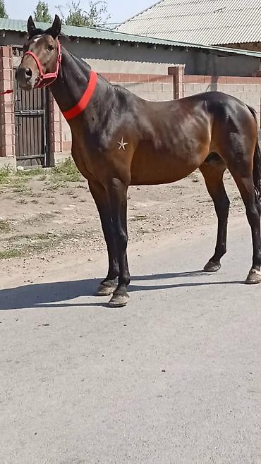 Төрт жаш жазга эки асый болот буттары таза ат айабай курч оозу элпек Лошадь жеребец, масть гнедая с тёмной гривой и хвостом. Корпус мощный, глубокая грудь, длинная шея, крепкие конечности и правильная постановка. На левом боку клеймо в виде звезды.