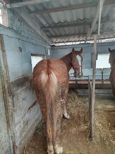 Лошадь гнедой масти - Порода: без указания, компактного сложения - Масть: гнедая, темная грива и хвост, отметина на лбу (звездочка) - Пол: не указан - Особенности: спокойная в недоуздке, стоит при...