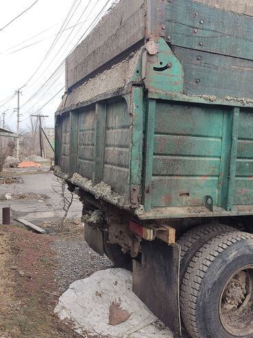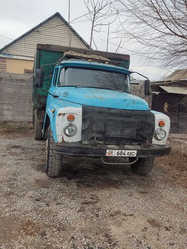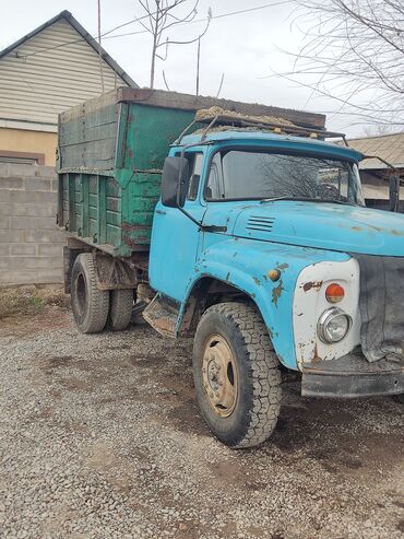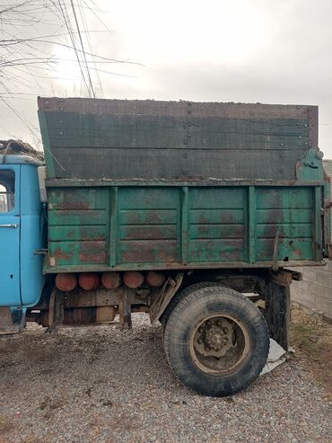 ЗИЛ самосвал, классическая кабина синего цвета с белыми крыльями. Грузовая платформа металлическая, с наращенными бортами из досок по периметру для увеличения объема. Борта распашные, усиленные, с наружными петлями и защелками. Под кузовом установлены баллоны ГБО (газовые цилиндры), что позволяет использовать автомобиль на газовом топливе.