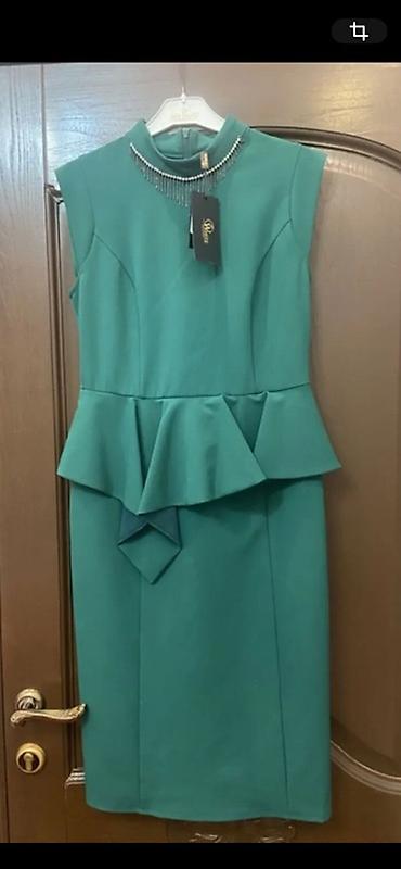 - Детали: баска по линии талии с асимметричной драпировкой; воротник-стойка, украшенный россыпью страз и подвесками; потайная молния сзади.