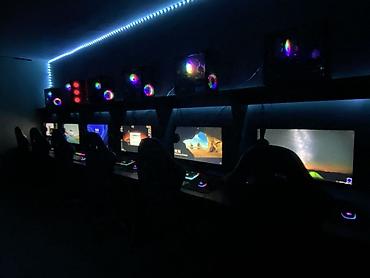 - Ряд из высокопроизводительных игровых компьютеров в одинаковой сборке, оформленных с RGB‑подсветкой. Корпуса с прозрачной боковой панелью, аккуратная укладка кабелей, верхняя полка для системных блоков.