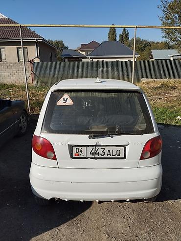 Daewoo Matiz, 5‑дверный хэтчбек, белый цвет. Номерной знак KG 443 ALQ. На заднем стекле установлен знак «У».