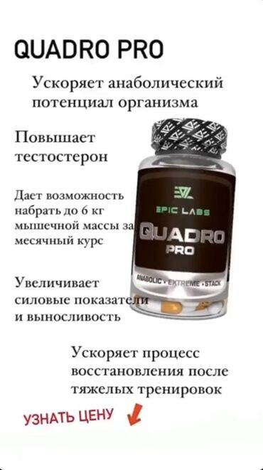 Также в наличии QUADRO PRO от EPIC LABS — комплексная спортивная добавка в капсулах помогает набрать качественную мышечную массу.