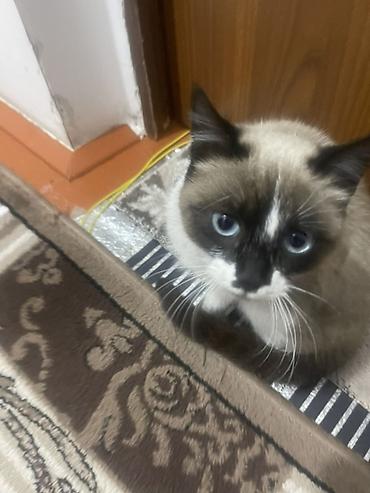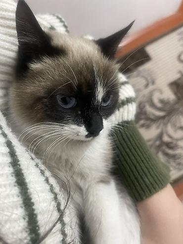 Кошка с сиамским типом окраса и ярко-голубыми глазами. Компактная