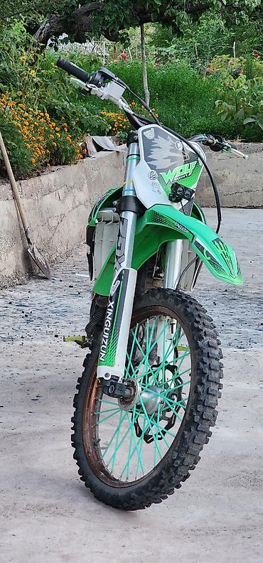 Мотоцикл кроссовый, предназначенный для езды по бездорожью и пересеченной местности. Оснащен мощным двигателем и имеет прочную конструкцию, что обеспечивает надежность и долговечность в экстремальных условиях. Яркий зеленый цвет и агрессивный дизайн делают его заметным на трассе. Подходит для любителей мотокросса и активного отдыха.
