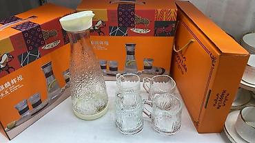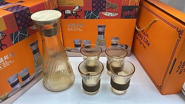 - графин из рифлёного стекла с крышкой/носиком (разные варианты дизайна: прозрачный, янтарный или с градиентом; встречаются крышки из бамбука, пластика или силикона);
