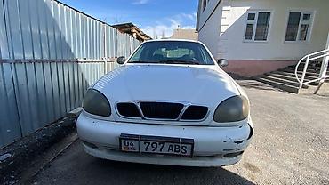 Daewoo Lanos, седан, белый цвет. Основные особенности: - Передние противотуманные фары, линзы с белым светом; ближний/габариты включены на фото. - Наклейка на лобовом стекле Kyrgyzstan. - Чер...