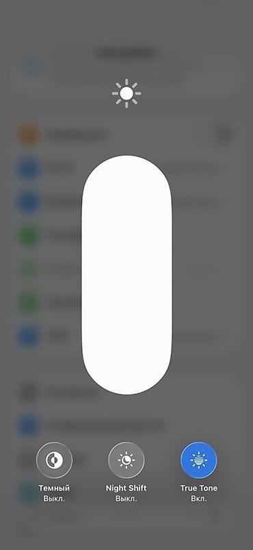 - iOS с панелью управления яркостью, режимами «Тёмный», Night Shift, True Tone (вкл. на скриншоте)