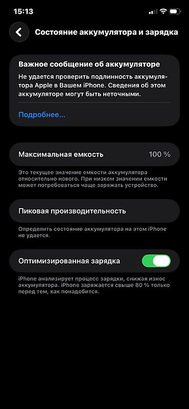 - На скриншоте настроек «Состояние аккумулятора» отображается уведомление «Не удаётся проверить подлинность аккумулятора. Максимальная ёмкость 100%».