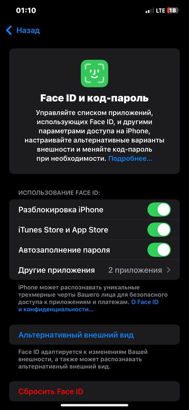 - Разблокировка по лицу Face ID (работает; в настройках включены разблокировка iPhone, iTunes/App Store и автозаполнение паролей)
