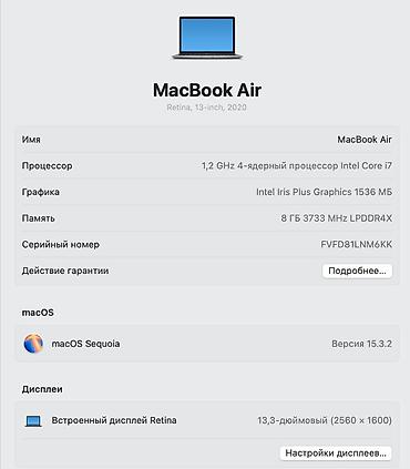 MacBook Air 13" (M1, 2020) - Процессор: Apple M1 - Память: 16 ГБ - Накопитель: 512 ГБ (Macintosh HD: доступно ~463 ГБ) - Дисплей: 13.3" Retina с тонкими рамками - Клавиатура: Magic Keyboard с подс...