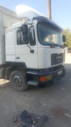 Грузовой автомобиль MAN (кабина оранжевая), тентованный бортовой. Основные особенности: - Колесная формула 4x2, задняя тележка односкатная. - Дизельный двигатель (марка MAN), передний привод на ру...