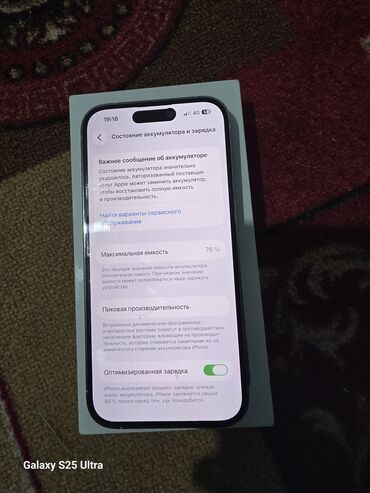 - На экране «Состояние аккумулятора» отображается максимальная ёмкость 76%, включена «Оптимизированная зарядка».