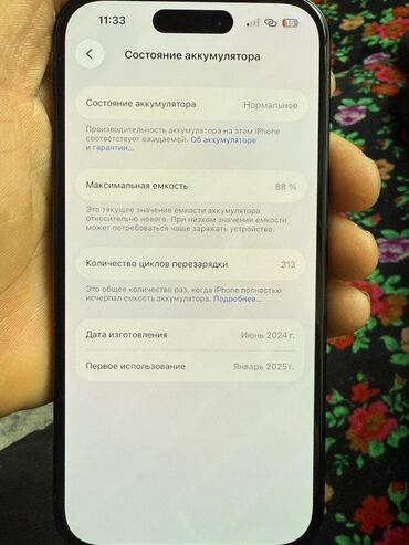 - Аккумулятор: максимальная ёмкость 88%, 313 циклов перезарядки. Состояние аккумулятора в системе отображается как «Нормальное».