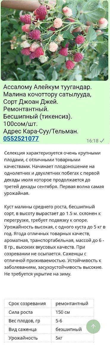 Принимаем заказы на саженцы малины.сорт «полька» также есть ежевика сорт натчес,блек-жем Малина кочот сатылат: Геракл 10 сом Полька 25 сом Полана 35 сом Мапема 100 сом Маравила 100 сом Дельнива ...