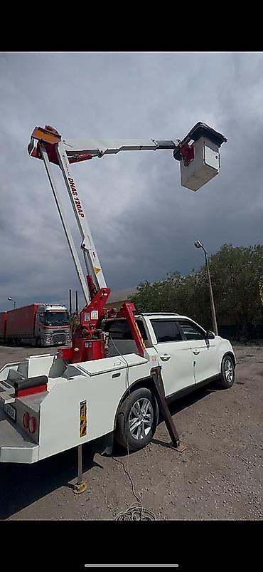 Автовышка на пикапе (компактная коленчато‑телескопическая DHAS 120AP) Описание: - Маневренная автовышка, смонтированная на легком пикапе с двойной кабиной. - Рабочая высота до ~12 м (указание на с...