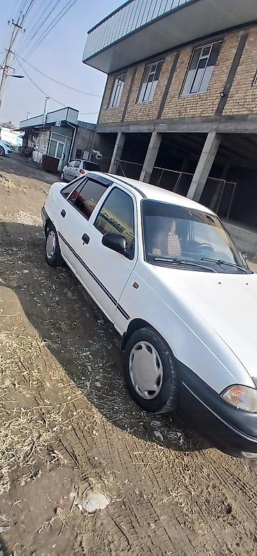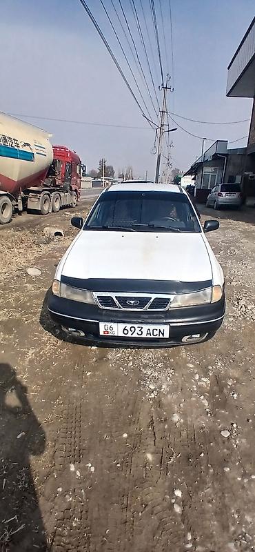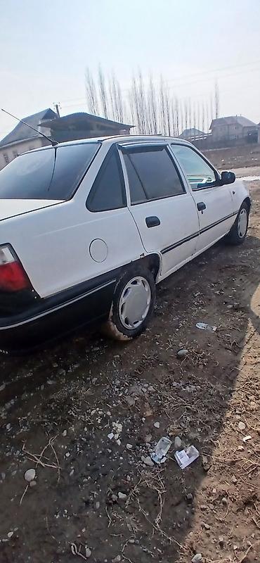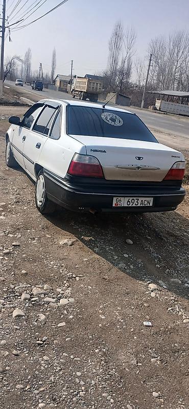 Daewoo Nexia седан, белый цвет, 4 двери, тонированные стёкла заднего ряда и стекла багажника. Передняя часть с дефлектором капота. Бамперы и молдинги в черном цвете, заводские колпаки на стальных дисках. Задняя эмблема и надпись Nexia, двигатель DOHC по шильдику. Антенна на крыше, ветровики на передних дверях. Оптика штатная: передние прямоугольные фары, задние двухсекционные фонари. Номера KG. Просторный салон, классический багажник седана. Подойдет для повседневных поездок и города: экономичный класс, простой в обслуживании, недорогие расходники.