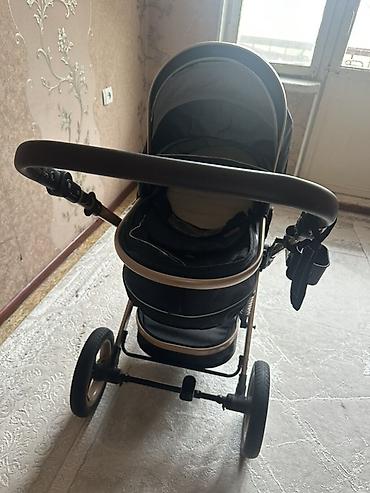 Детская коляска-трансформер 2 в 1, черная с бежевыми элементами.