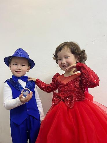 - Аксессуары в комплекте: бабочка и шляпа у мальчика; декоративный бант на платье (в красной версии).