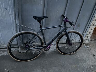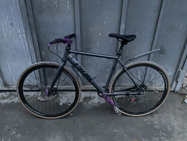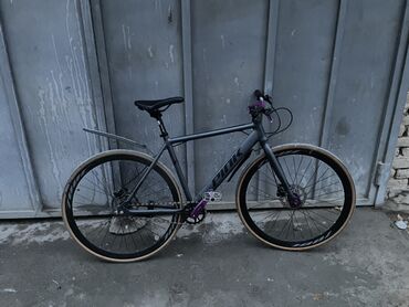 - Рама и вилка: алюминий, геометрия для быстрых поездок по городу и лёгкому гревелу. Цвет — матовый тёмно‑серый с крупным логотипом.