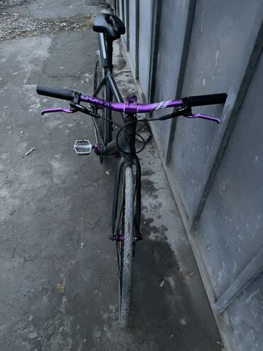 - Руль: прямой широкий с фиолетовыми акцентами (руль, вынос, тормозные ручки), даёт уверенное управление.