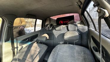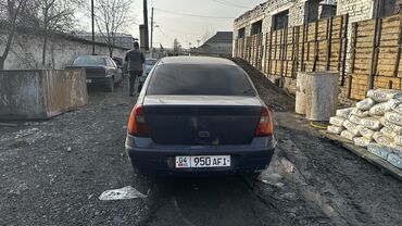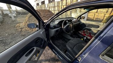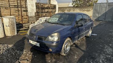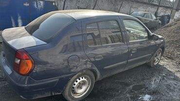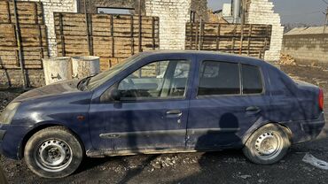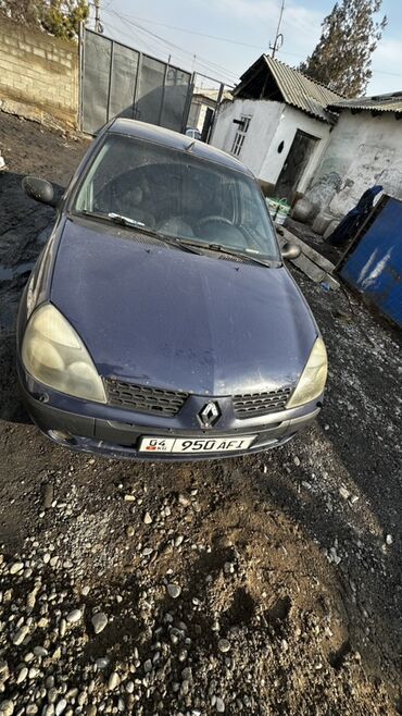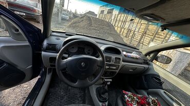 Renault Clio II, хэтчбек, левый руль, темно‑синий цвет кузова. 5‑дверный салон с тканевой обивкой и подголовниками на заднем ряду. Рулевое колесо с эмблемой Renault, приборная панель с аналоговыми шкалами, центральная консоль с воздуховодами, магнитолой и блоком управления печкой. Механическая коробка передач, ручной тормоз, резиновые коврики. Электростеклоподъемники спереди, боковые карманы в дверях, регулируемые ремни безопасности. Сзади установлена акустика (сабвуфер/короб). Освещение салона, солнцезащитные козырьки, перчаточный ящик. Компаκтный городской автомобиль с экономичным двигателем и удобной посадкой, практичный в повседневной эксплуатации. Номер на фото: KG 950 AFI.