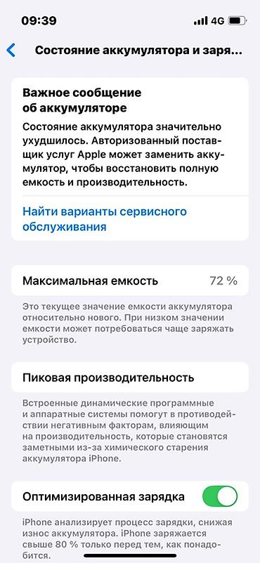 - Состояние аккумулятора: максимальная емкость 72%, отображается сообщение о необходимости сервисной замены