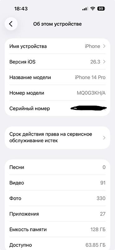 - Модель: iPhone 14 Pro (номер модели MQ0G3KH/A, видно на скриншоте)