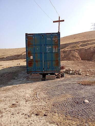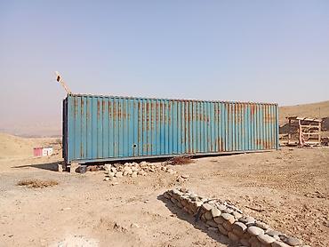 Морской контейнер 40 футов (приблизительно 12 м). Стальной, цельносварной каркас, рифлёные стенки, двойные распашные двери с запорными штангами. Цвет — синий, местами с заводской маркировкой (указаны грузоподъёмность и объём). Контейнер установлен на блоки.