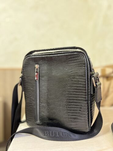 Сумка через плечо мужская, черная, с тиснением под рептилию.