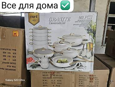 На упаковке: Granite Casserole Set, 23 PCS, модель OSFE FE-10. Подходит для приготовления, тушения, жарки и приготовления на пару, а также для сервировки в одном стиле. Отличный комплексный комплект «все для дома».