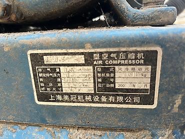 - Информационная табличка: AIR COMPRESSOR, производство Shanghai Meiguan Machinery (上海美冠机械设备有限公司). На шильдике указаны параметры (подача в м³/мин, давление в МПа, мощность в кВт, частота вращения в об/мин, масса и габариты).