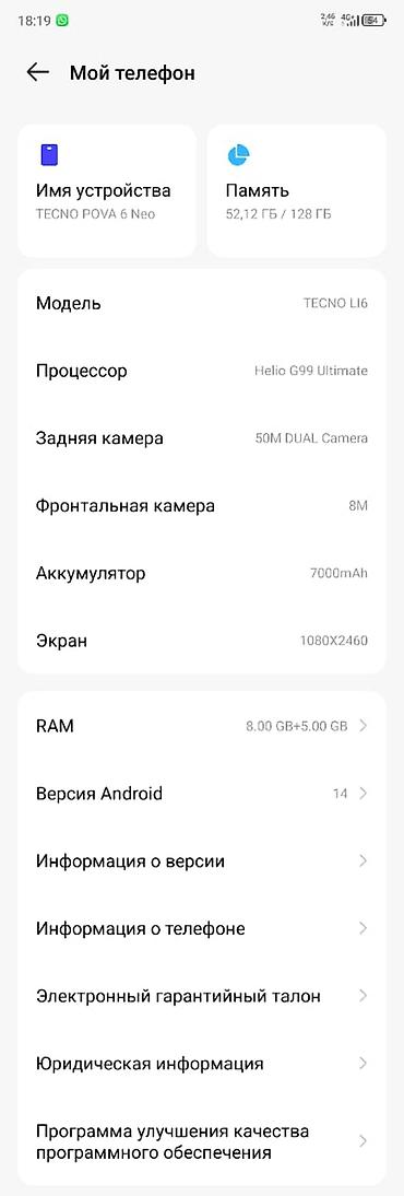 TECNO POVA Neo — смартфон с большим экраном и мощной автономностью для игр, видео и повседневных задач. Ключевые особенности: - Экран 6.8" с узкими рамками и вырезом под фронтальную камеру — удобн...