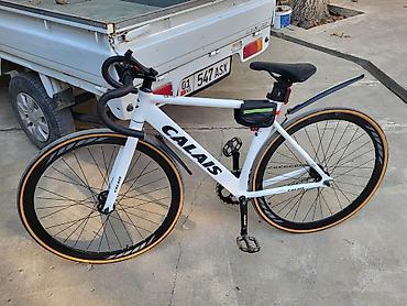 Шоссейный велосипед Calais с легкой рамой белого цвета, оснащенный черными изогнутыми рулями (бараньи рога) для спортивной посадки и улучшения аэродинамики. Обода колес черные, с контрастной золотисто-коричневой полосой по краю шин, что придает велосипеду стильный вид. Установлены дисковые тормоза для надежного и эффективного торможения. Модель подходит для скоростной езды по асфальтированным дорогам и тренировок. Оснащен компактной подседельной сумкой для хранения мелочей и флягодержателем, что делает его удобным для длительных поездок. Педали черного цвета с рельефной поверхностью обеспечивают хороший контакт с обувью. Заднее крыло предотвращает разбрызгивание грязи
