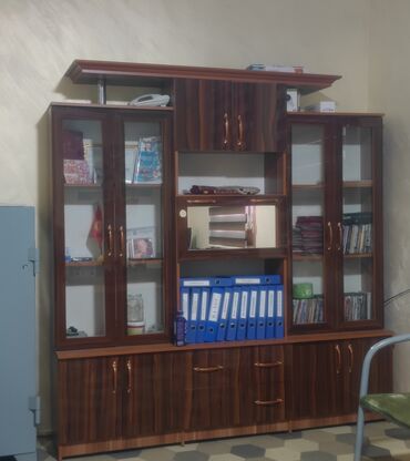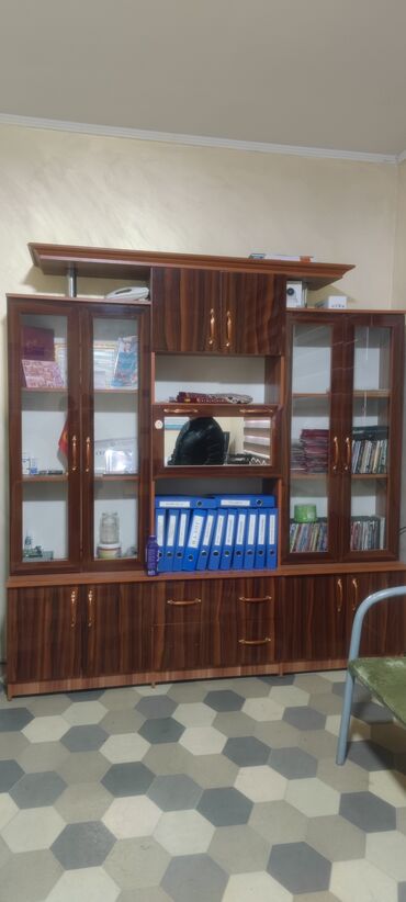 Практичная стенка подойдёт для документов, книг, посуды, техники и декоративных предметов. Оптимальна для кабинета, гостиной или приёмной. Цвет — тёмный орех/махагон. Продаётся как единый комплект.