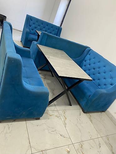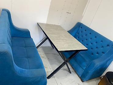 Комплект мебели для кафе/ресторана: стол и два диванчика - Компоновка: два мягких дивана, расположенных друг напротив друга, и прямоугольный обеденный стол. - Обивка диванов: бархатистая ткань нас...