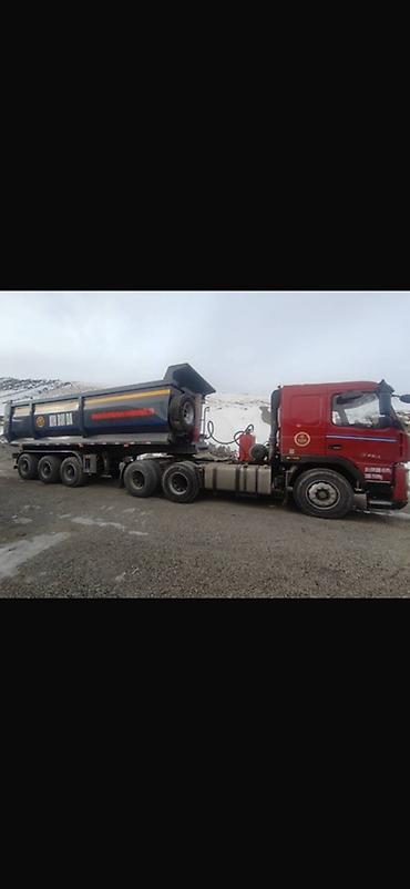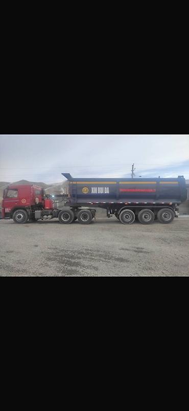 - Полуприцеп-самосвал XIN RUI DA: трехосный, усиленная рама, высокий стальной кузов с задней распашной/опрокидывающейся дверью, гидроподъем кузова. На борту закреплено запасное колесо.