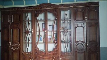 - Большой стендер/шкаф-витрина для гостиной: центральные стеклянные створки с резными декоративными решётками, открытые полки для декора и документов, по бокам — закрытые секции с распашными дверцами. Сверху фигурный карниз с резьбой.