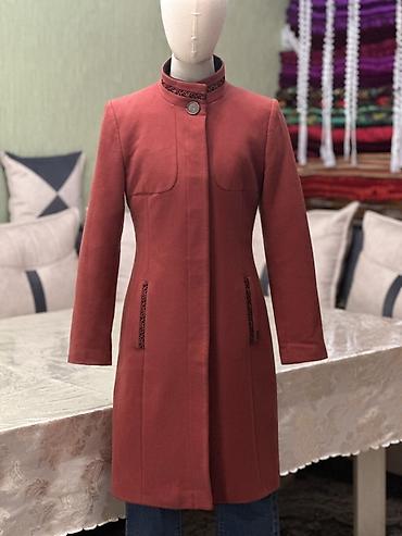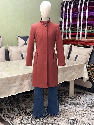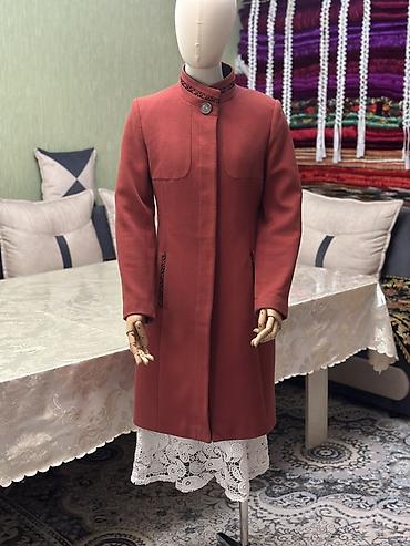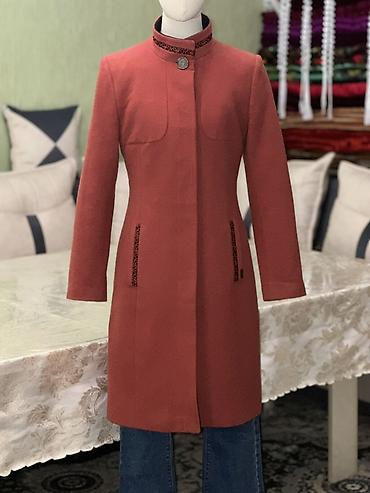 Женское пальто с стойким воротником, кораллового цвета.