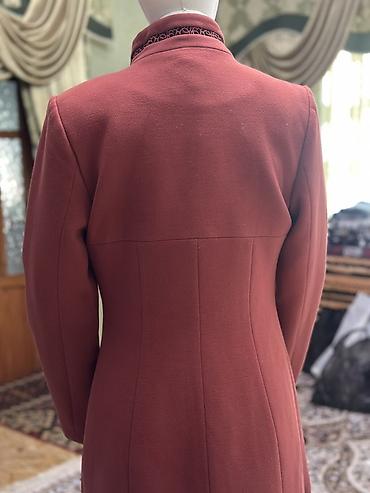Женское пальто с стойким воротником, кораллового цвета. Особенности