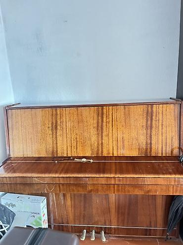 - Корпус: классический кабинетный формат, отделка под тёплый орех/махагон, закрывающаяся крышка клавиатуры.