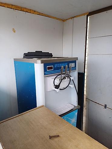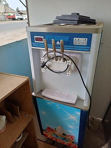 Автомат для производства мягкого мороженого, предназначенный для приготовления трех видов мороженого. Оснащен тремя рычагами выдачи, что позволяет предлагать два отдельных вкуса и один смешанный. Корпус машины выполнен из комбинации синих и белых панелей с декоративным рисунком в нижней части. На верхней поверхности расположены лотки для ингредиентов. Устройство подходит для использования в точках общественного питания, кафе или специализированных киосках по продаже мороженого.