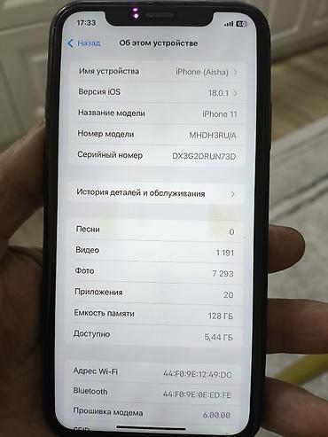 IPhone 11, модель MHDH3RU/A, цвет черный. Память 128 ГБ (доступно 5,44 ГБ на момент снимка экрана). Установлена iOS 18.0.1. Серийный номер: DX3G2DRUN73D (указан на скриншоте «Об этом устройстве»). Поддержка Wi‑Fi и Bluetooth; прошивка модема 6.00.00. Две основные камеры с вспышкой, фронтальная камера в вырезе дисплея. На устройстве: 0 песен, 1 191 видео, 7 293 фото, 20 приложений. Черный глянцевый корпус, экран без видимых следов на фото.
