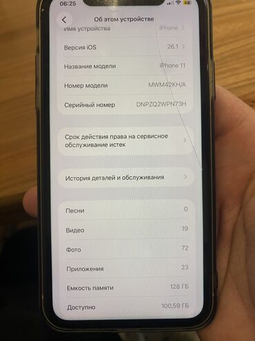 IPhone 11, 128 ГБ Характеристики и детали по фото экрана: - Модель: iPhone 11 (модельный номер MWM02KH/A) - Объём памяти: 128 GB, доступно ~97,17 GB - Версия iOS: 18.6.2 - Face ID: работает, включ...