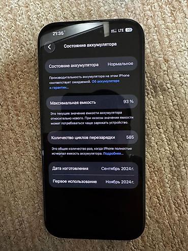 - Состояние аккумулятора по разделу «Состояние аккумулятора»: максимальная емкость 93%, количество циклов перезарядки 585, статус «Нормальное».