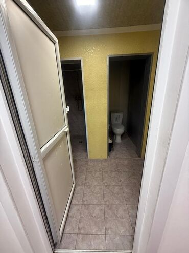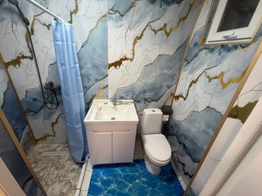 - Современный санузел: душ с шторкой и трапом в полу, унитаз, тумба‑раковина с зеркалом, вытяжка/окно.